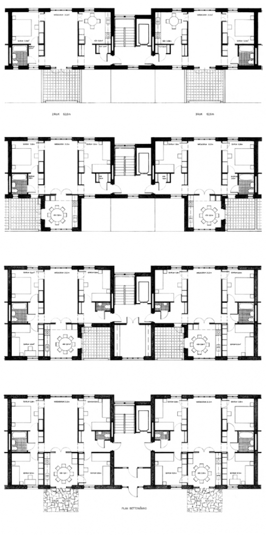 \"Terrasshus I\" is an attempt to combine the narrow dimensions of contemporary housing with apartments containing individual terraces. The apartment sizes are modest and they all comply with the standard building recommendations of today. By each new storey, one bedroom is eliminated and replaced by a terrace. All the storage components are located along the interior main partition wall with full-height cabinets at the passages. A way to replace thin gypsum-board walls by zones of space-defining significance.